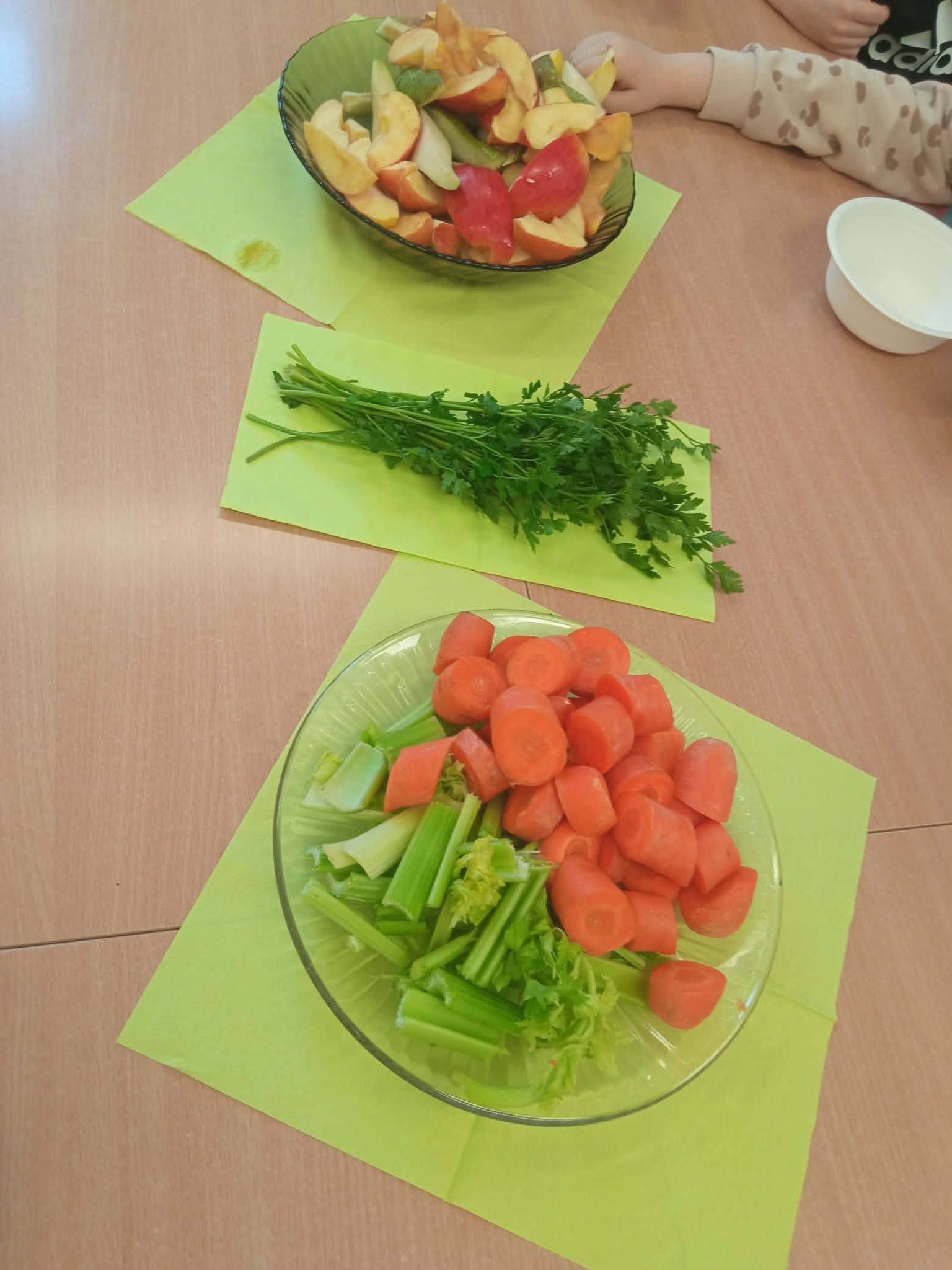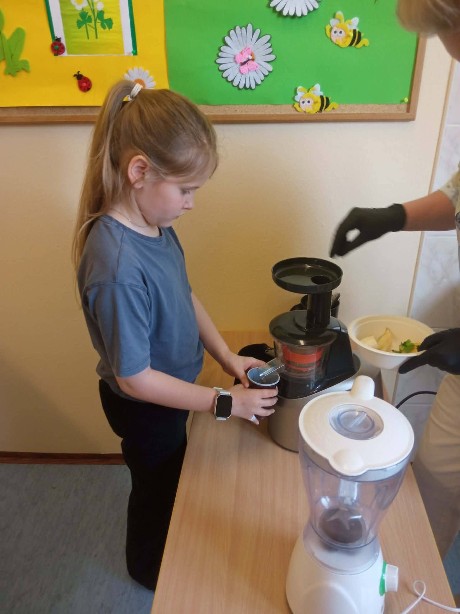 Podczas zajęć nasi najmłodsi kucharze wcielili się w rolę ekspertów od zdrowego żywienia. Dzieci samodzielnie komponowały i wyciskały świeże soki z owoców i warzyw. W ruch poszły soczyste jabłka, słodkie pomarańcze, chrupiące marchewki i pełną witamin natkę z pietruszki oraz seler naciowy.