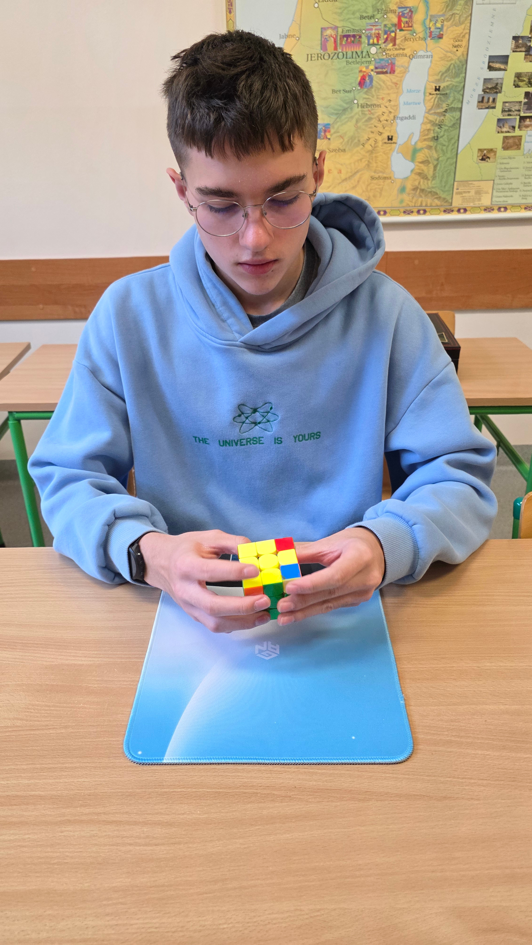 Uczeń naszej szkoły Adam Borek to prawdziwy mistrz! Ten mały sześcian dosłownie pali się w jego rękach. Jeden z najlepszych czasów Adama, to 16 sekund. Oprócz talentu posiada niezbędne akcesoria ulokowane w eleganckiej walizce. Sam bardzo skromnie opowiada o sobie: "Nazywam się Adam i od dwóch lat pasjonuję się układaniem kostki Rubika. Zaczęło się zupełnie spontanicznie, a dziś to coś, co naprawdę mnie wciągnęło. Mam 14 lat i wciąż sprawia mi to dużo satysfakcji. Wierzę, że każdy może się tego nauczyć – wystarczy trochę cierpliwości i chęci."