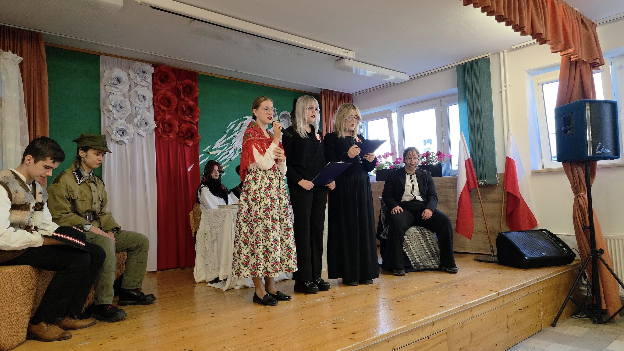 Podczas występu zabrzmiały piosenki patriotyczne, m.in. „Nie idź na wojnę”, „Sto dwadzieścia trzy” oraz „Szybuj orle”, która zakończyła uroczystość w nastroju zadumy i refleksji. Uczniowie w rolach narratorów i aktorów z wielkim zaangażowaniem oddali emocje towarzyszące czasom wojny i niewoli.